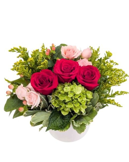 Bring a splash of joy to any occasion with The Lucky One Deluxe! This fun and bright floral arrangement is a delightful mix of lush mini green hydrangeas, delicate light pink spray roses, and classic red roses.