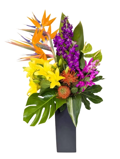 Make a bold statement with Obsidian, a premier tropical flower arrangement designed to bring the exotic beauty of the islands directly to your doorstep. This striking architectural piece features vibrant Birds of Paradise, sun-kissed yellow lilies, and majestic purple blossoms, all anchored by the deep, waxy green of a statement Monstera leaf.